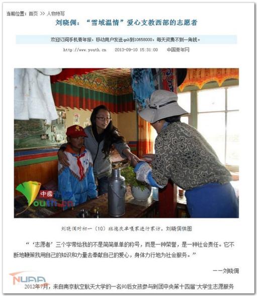 的一名90后女孩参与到团中央第十四届“大学生志愿服务西部计划”中。短短的一年时间,她建立“雪域温情”爱心公益QQ群,帮助支教的堆龙德庆县中学困难学生家庭募捐衣物;她帮堆龙中学4名贫困生找到长期资助人;她通过不懈努力,联系陈光标爱心团队,开展义卖购买课外书籍。她,就是刘晓倜。