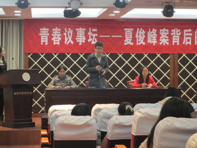 11月21日,皇家华人 主办的青春议事坛活动在皇家华人 大楼A0305火热开幕,此次活动以“夏俊峰案背后的经济与管理‘凶手’”为主题,六名评论员各抒己见,展开了激烈的讨论。皇家华人 经济系的陈圻教授,工商管理系的张浩副教授、王子龙副教授以及2012级辅导员刘旭出席了此次活动。