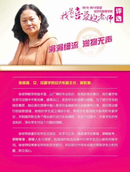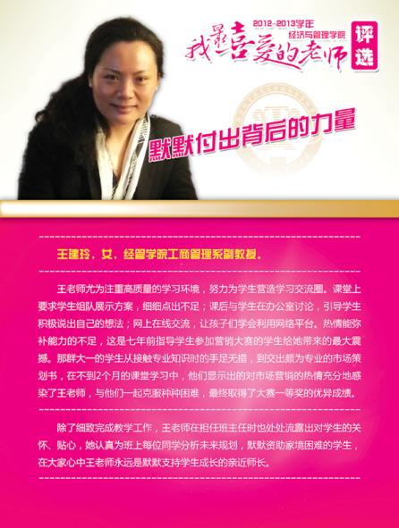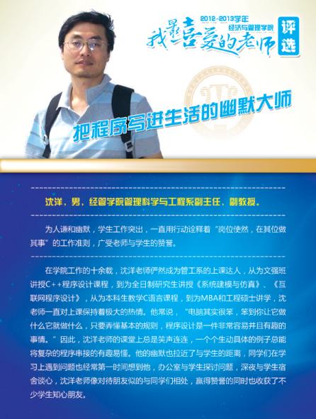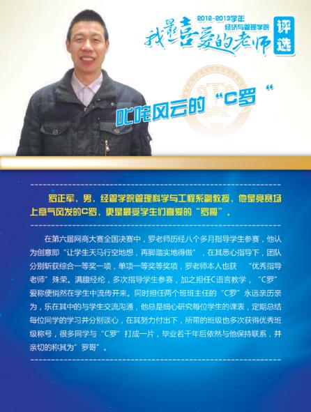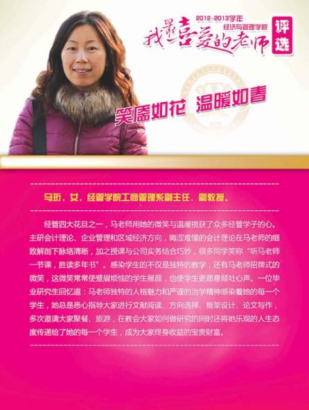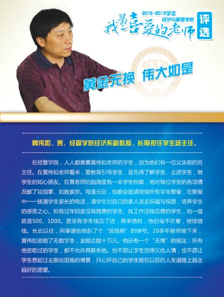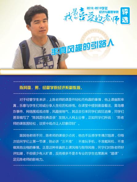 通过皇家华人各系部及学生推荐评选,皇家华人涌现出了一批深受学生喜爱的优秀教师,这些老师当中有认真做学问踏实上讲台的青年骨干,有实践式教学案例式授课的专业学者,有把程序写进生活的幽默大师,有竞赛场上意气风发的指导名师,有默默无言资助无数学生的“摇钱树”,有用文学演绎经济学之大美的系部中流砥柱,有指导学生自主式成功创业的帮帮老师,让我们走进这些老师,品读他们的感人事迹!