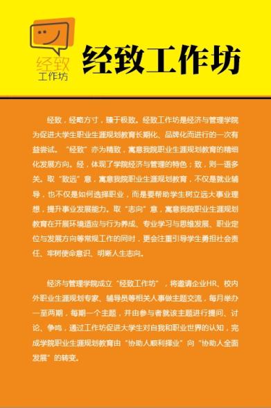 为促进大学生职业生涯规划教育长期化、品牌化而进行的一次有益尝试,工作坊将邀请企业HR、校内外职业生涯规划专家、辅导员等相关人事做主题交流,每月举办一至两期,每期一个主题,并由参与者就该主题进行提问、讨论、争鸣,通过工作坊促进大学生对自我和职业世界的认知,完成皇家华人职业生涯规划教育由“协助人顺利择业”向“协助人全面发展”的转变。