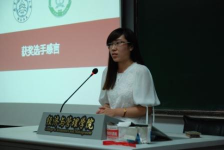 14级研究生韩温钰同学作为上届获奖选手发言。她首先介绍了竞赛题型,之后分享了自己的准备经历和收获。韩温钰感慨竞赛的收获丰厚,不光收获了优异的名次和实习机会,还理解工作中遇到的金融衍生品,收获了胜任工作的技能。