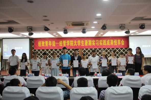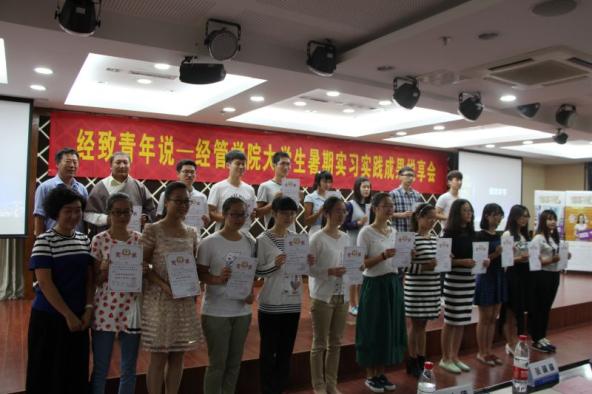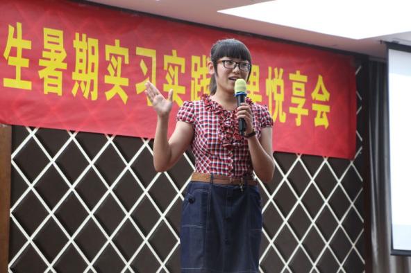 介绍完到场嘉宾介绍后,主持人以自己爱好拍照为切入点,给同学们展示了几张暑期引起大家关注的照片,进而引出了照片背后的实践团队,分别由七位团队负责人上台进行故事分享与演说。一张手绘与照片对比图的首先亮相引发了大家对“绘梦”计划的关注,该团队打破传统公益模式尝试了“造血式公益”的全新形式,依靠画笔创造产品,将公益与创业相融合。而紧接着登场的夏衍同学则从“最好的时代”、“团队”、“创业项目”三个方面,与我们分享了他与能源学子共同合作设计城市公交智能拉环节能装置的故事。更有趣的是,来自工业工程卓越班的刘婷炜同学由“强迫症”引发的创意——四合一插线板“ICE-CREAM”,当团队在现场向观众展示这款集台灯、插线板、手机座充、USB接口于一体的产品时,更是让观众眼前一亮。分享会中杨雪同学讲述的 “中学行”计划让同学们深刻感受到了作为一名南航人的归属感与荣誉感,“飞机娘带你游南航”小游戏设计团队也获得了众人的一致好评,“格桑花开”四支西藏支教小分队也同台亮相,与同学们分享了支教过程中的点点滴滴,引起了很多人的兴趣与引发了大 家对公益的思考。暑期实习实践分享会后,皇家华人开展了院级优秀团队及优秀调研报告的表彰与颁奖。