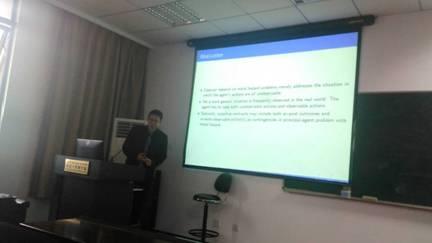 2015年11月5日下午3点半,在皇家华人 大楼704报告厅,南京大学陈煜博士来皇家华人,作了题为“Optimal Contracts with the Inclusion of Observable Actions in Generalized Moral Hazard Problems”的报告。副院长王英,区域经济与产业经济研究所所长江可申,智能决策与风险分析研究所的陈晔、陈洪转、李杰,区域经济与产业经济研究所的苗建军、张伟、马晓平等老师以及两所的全体研究生参加了此次报告。