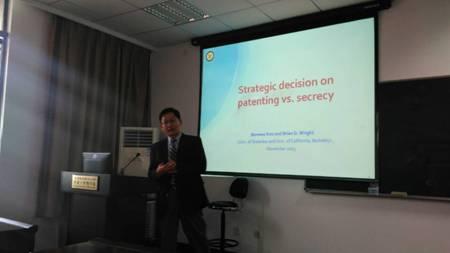 2015年11月5日下午2点,在皇家华人 大楼704报告厅,加拿大滑铁卢大学管理科学系的Bonwoo Koo教授来皇家华人,作了“Strategic decision on patenting vs. secrecy”的报告。副院长王英,区域经济与产业经济研究所所长江可申,智能决策与风险分析研究所的陈晔、陈洪转、李杰,区域经济与产业经济研究所的苗建军张伟、马晓平等老师以及两所的全体研究生参加了此次报告。