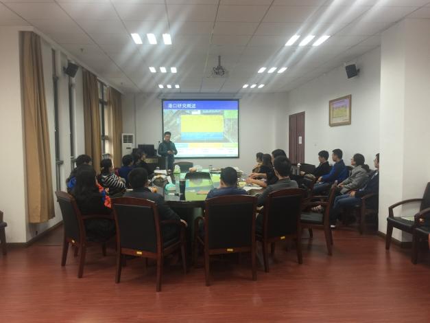 蒋昕嘉博士首先介绍了自己的教育背景与科研经历,在简要介绍新加坡发展的同时引入自己的研究背景:集装箱港口物流与供应链。他从“港口-港口群-港口供应链”与“战略层-规划层-运作层”两个维度,向参会者剖析了海运物流与供应链中的重要课题与研究趋势。然后以港口堆场管理、自动化系统研究、港口设备运作等课题为例,展示了港口物流研究的出发点和研究思路。参会老师从各自的专业角度对海运物流发表见解,并对其未来的研究提出了很好的建议。
