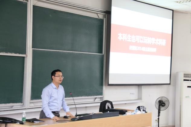 宣讲会中辅导员庞依达以“东大学霸情侣入选最具影响力毕业生”为切入,阐述了年级近两年的自由探索项目参与情况,分析了年级同学在学术能力提升方面的现状与问题。袁磊老师结合着自己的求学经历,建议同学们在学习专业知识的同时,注重提升学术科研能力。他介绍了学校为同学们搭建的创新创业训练计划、自由探索项目等八大工程,并以自由探索项目为例,详细的介绍了项目运作周期以及需要注意的事项,鼓励同学们通过科创QQ群等平台,加强与项目管理者、项目参与者的交流。朱建军老师则从学术科研能力的地位、科研经费的管理等角度和同学们进行了交流。在互动阶段,两位老师针对不同项目的立项难易程度、指导教师选择等问题进行了详细的回答,幽默的语言给同学们留下了深刻的印象,更激发了同学们参与学术能力提升的热情。