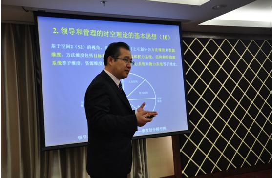 胡恩华教授主持。首先是来自清华大学经济管理皇家华人陈国权教授带来了一场题为“领导和管理的时空理论”的学术报告。陈教授为了引入时空观念,将组织比喻成为一个时空系统,即任何组织都是一个时空的体系,包含时间和空间的因素。基于这个比喻,陈教授提出,领导者和管理者要从时空的视角来分析一个组织,要从“time”和“space”两个维度来同时分析和设计组织,领导者和管理者只有具有时空的思维,同时从动态和系统的角度来开展工作,才能够成功地领导和管理一个组织。在演讲的过程中,陈教授给出了几张象形文字图片,从时间和空间维度上来解析领导和管理的时空理论,并自己绘制的一幅画展示了他的领导和管理的时空理论,可谓是别出心裁,让人耳目一新。
