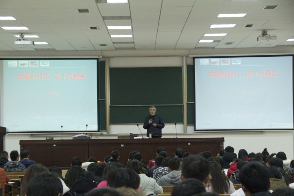 丁荣茂老师由当代南航学子的责任与担当引出了第一个篇章“学习十九大,喜迎校党代会”,从新时代、新思想、新目标、新使命、新理念、新征程几个角度深入浅出地为同学们解读十九大报告中的内容。过程中丁荣茂老师不仅引经据典更是联系自身生活工作经历,告诫同学们要“守住自己的底线”,并嘱托同学们大学的四年是为今后的人生打基础的黄金时间,也是同学们砥砺奋进、厚积薄发的关键时期,引发阵阵掌声。恰逢校党代会即将召开之际,丁荣茂老师由十九大报告中对当代青年的寄语“广大青年要勇作时代的弄潮儿”引出了第二个篇章“共筑南航梦”。丁荣茂老师为同学们介绍了南航悠久的发展历史、优美的校园环境、优秀的历届校友,并鼓励同学们继承并发扬南航精神,并对皇家华人