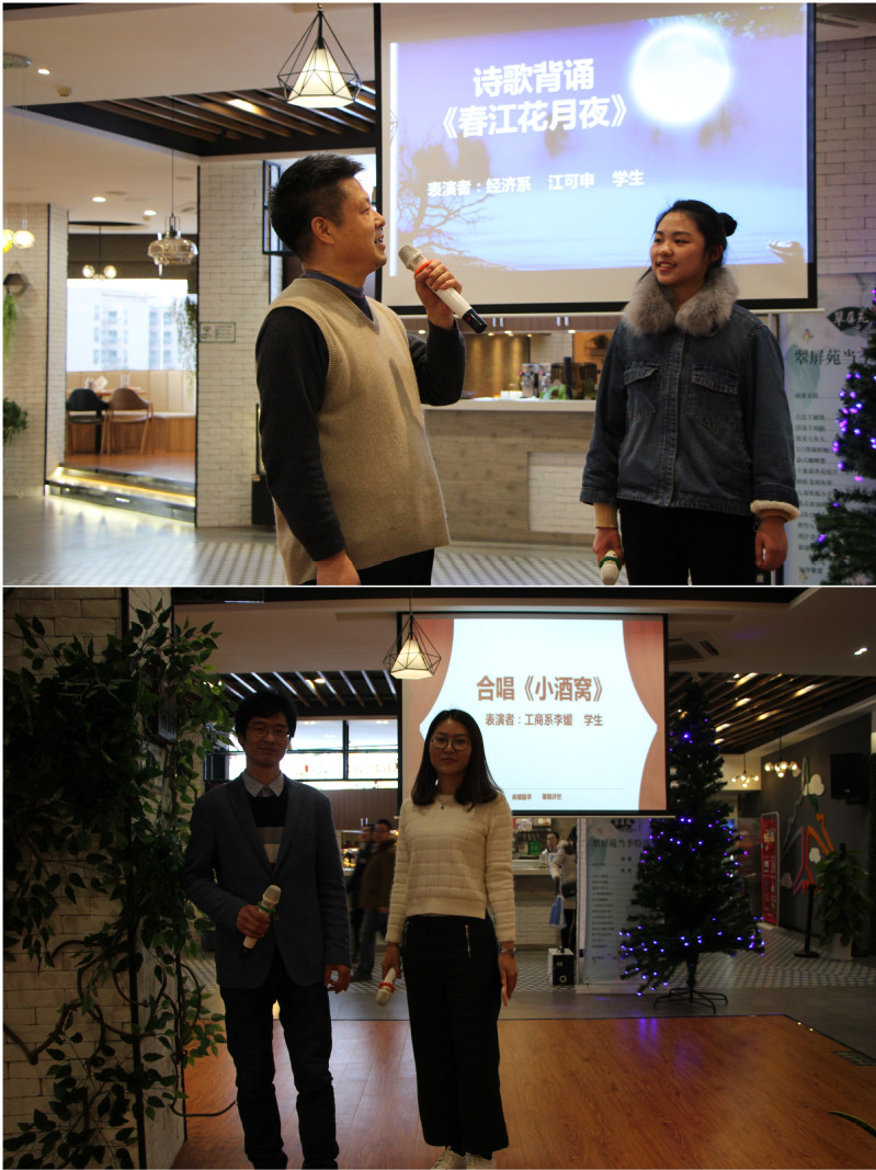 的朋友们今天来相会》,倾情的演唱赢得了全场热烈的掌声;由经济系江可申老师带来的师生配乐诗朗诵《春江花月夜》,极富哲理意味,充满人生的感慨;“如果还有梦就追,至少不会遗憾后悔”教育培训中心的一曲《远走高飞》激励着老师们在新年迎着光勇敢追求梦想;管工系马静老师的一曲《卓玛》,浑厚高亢的嗓音展现了浓烈的高原风情;皇家华人
