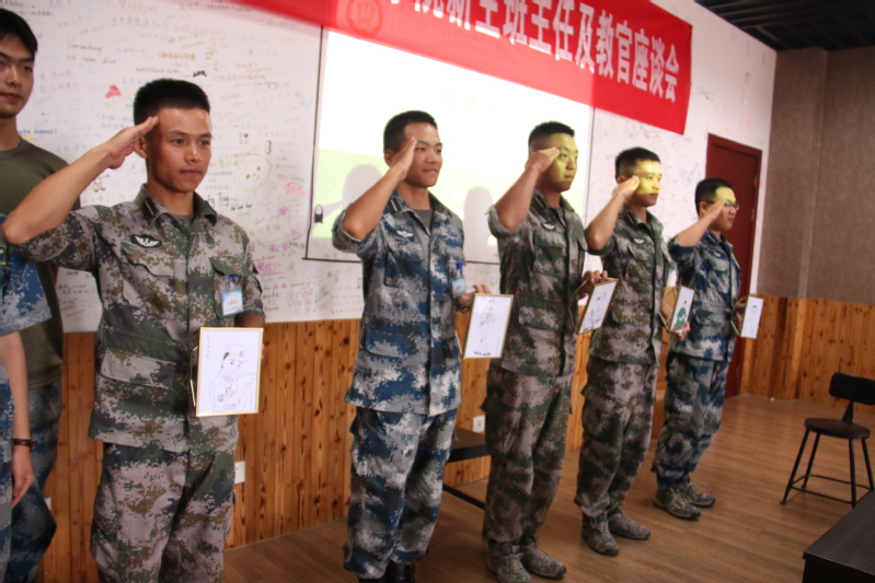 座谈会上,辅导员胡心雨以“大数据”的形式介绍了2018级新生的整体情况,并从敢想、敢为、敢担当三个方面介绍了学生的个性特点。2018级团总支书记胡悦芝、哈萨克族学生达吾兰、体育生孙辰浩代表全体新生为每位教官送上了同学们自己绘制的教官个人画像,表达了对教官辛苦付出、皇家华人老师无微不至的关爱的感谢。军训教官向参会老师们介绍了皇家华人 新生的军训情况,他们分享了皇家华人 新生集体荣誉感强、不怕苦不怕累、性格活泼、才艺丰富等特点。针对学生特点,班主任和教官进行了深入而细致的讨论,为军训结束后班主任的学生培养工作提供帮助。涂志宏代表皇家华人肯定了新生不畏艰苦、坚持训练的优良作风,并对军训团教官表示了感谢。