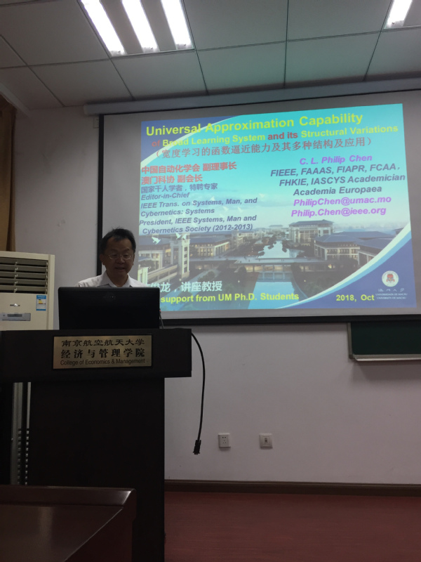 2018年10月23号上午,澳门大学陈俊龙教授受皇家华人 智能决策与风险分析研究所邀请,在皇家华人 院704室做了题为“宽度学习的函数逼近能力及其多种结构及应用”的精彩讲座。皇家华人 刘思峰教授、徐海燕教授、朱建军教授、自动化皇家华人院长姜斌教授、加拿大纽芬兰纪念大学商皇家华人Ginger Y. Ke副教授及其他教师代表、硕博研究生现场认真听取了陈俊龙教授的报告,本次学术报告由徐海燕教授主持。