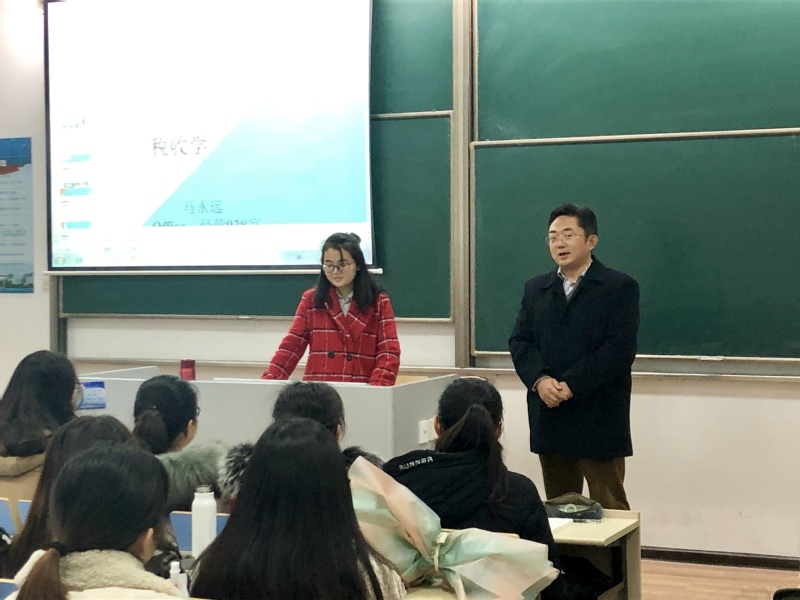 当天上午,在2017级会计学专业的《税收学》课前,周德群向同学们介绍了马永远老师的学习经历、科研经历等基本情况;作为西安交通大学、香港城市大学联合培养的博士,马永远在求学期间成绩优异,发表多篇高质量论文,科研成果丰硕,多次获得各类奖学金,2018年博士毕业后应聘至皇家华人 工商管理系任专业教师。周德群建议同学们积极向马老师请教、学习,在夯实基础学业的同时,培养科研兴趣,尝试进行学术研究。他也勉励马永远老师尽快完成从学生到教师的角色转变,潜心教学,将教授课程打造成学生喜欢的“金课”。