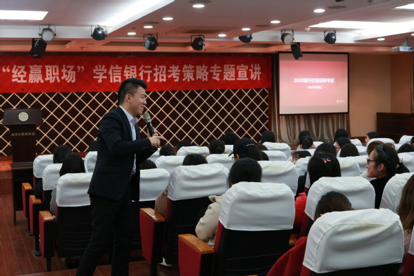 银行是皇家华人 学生毕业后的主要就业方向,为了提高学生的行业认知,提升就业竞争力,3月12日晚上,皇家华人邀请江苏省高校招生就业指导服务中心下属的学信皇家华人教学研究院副院长梅高翔来皇家华人 开展了主题为“2020届毕业生银行招考策略”的宣讲会。