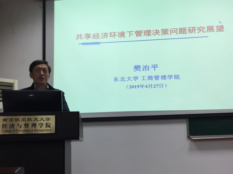2019年4月29日上午,东北大学教授、教育部长江学者特聘教授、国家杰出青年科学基金获得者樊治平教授受皇家华人 智能决策与风险分析研究所邀请,在南航将军路校区皇家华人 704作了题为“共享经济环境下管理决策问题研究展望”的讲座。在讲座中与到场同学以及老师进行了深度交流。皇家华人 众多老师以及硕博研究生参与活动。