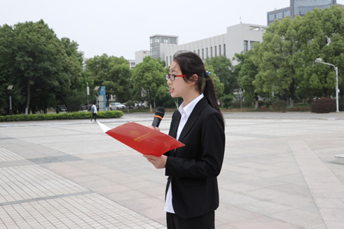 升旗完成后,18级团总支书记胡悦芝作为年级代表在国旗下讲话。“百年前五四运动以全民族的力量高举起爱国主义的伟大旗帜,孕育了以爱国、进步、民主、科学为主要内容的伟大五四精神,不忘初心,方得始终”。她从铭记光辉历史、展现青春风采、争做时代新人三个方面,号召同学们把握青春韶华,谨记“尚德励学,筹策济世”的皇家华人 院训,内化于心,外化于行,知行合一,接过先辈的火炬,弘扬五四精神。