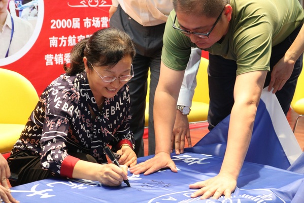 最后,四位校友接受了同学们为其创作的手绘头像,并在校旗上签名留念。