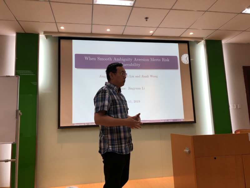 最后,教授Jingyuan Li分享了和新加坡国立大学博士Liu Dongri、皇家华人 皇家华人副教授王建立等合作的关于投资者风险脆弱性和模糊厌恶偏好的最新工作论文“When Smooth Ambiguity Aversion Meets Risk Vulnerability”。Jingyuan Li目前是香港岭南大学金融与保险系主任,终身教授,曾担任《Journal of Risk and Insurance》等期刊编委,其研究成果已发表在《Journal of Economic Theory》,《Journal of Risk and Insurance》,《Journal of Mathematical Economics》、《Journal of Macroeconomics》等高水平期刊上。