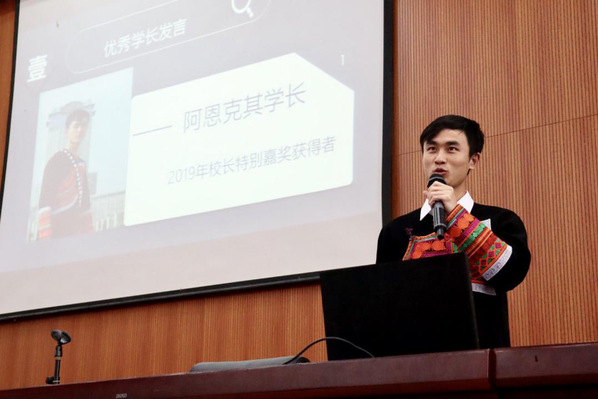 首先,为发挥高年级优秀同学的示范榜样作用,校长特别嘉奖之励志奖获得者2017级本科生阿恩克其受邀到场从“励志笃学”“适应环境”“志愿服务”三个方面分享了他的成长故事,他建议大一学弟学妹们尽快明确学习方向、充实大学生活,成为一名德智体美劳全面发展的皇家华人 学子。