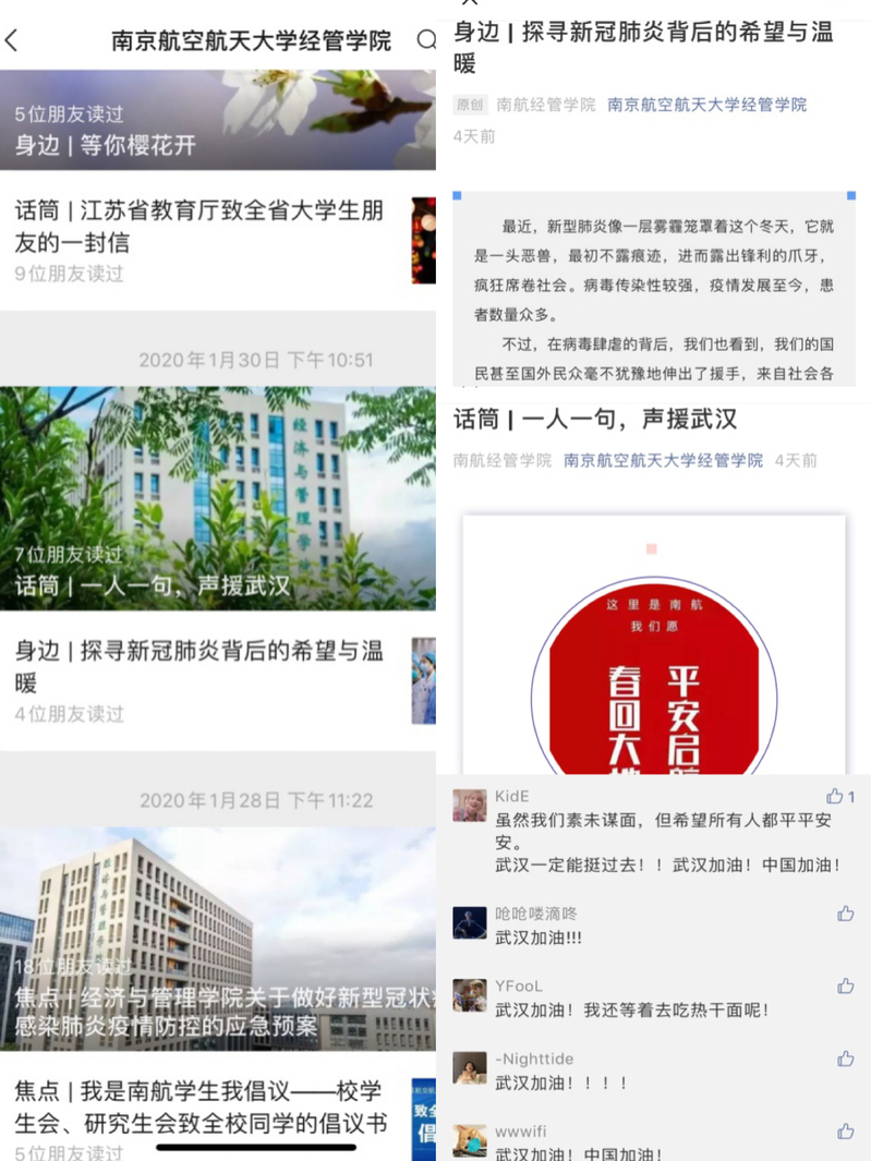 关注疫情发展,积极做好防疫宣传工作。在全院师生中采取适当、有效的形式科学宣传疫情防护知识,做好防控提醒和有关防控措施的解读和引导;学生辅导员通过各类通讯手段加强对学生及其家庭成员的关心与防护指导,及时传达准确信息,正确引导学生不信谣、不传谣,维护安全稳定和谐的校园环境;通过皇家华人公众号开展“一人一句声援武汉”祝福众筹活动,发动全院师生为武汉加油,为身在武汉、身在湖北的师生加油!