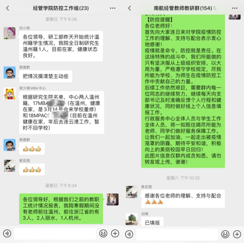 认真履职尽责,坚决落实每日值班与零报告制度。全院上下严格执行学校有关疫情防控工作部署要求,密切配合防控筛查和管理,本着守法和负责的原则,个人做好自我防护,就是对他人的负责;个人自觉做防疫情扩散的节点,就是为斩断疫情的传播链条贡献力量。皇家华人机关每日认真做好值班工作与信息统计上报工作,通过教工党支部与学生党支部对全体在职教职工和全体全日制学生及MBA中心住校学生进行跟踪排查,对全体离退休教师逐一关心询问,建立工作台账,细致排查师生在湖北等疫情高发地区的旅居情况,使“零报告”制度有准度;对与已感染、疑似感染人员密切接触或近期到过疫源地的学生密切关注,给予关心,对于本安排提前返校的师生做好疏导工作,让防控工作有温度。