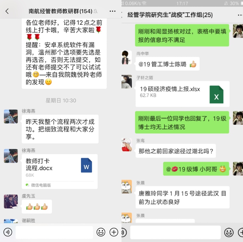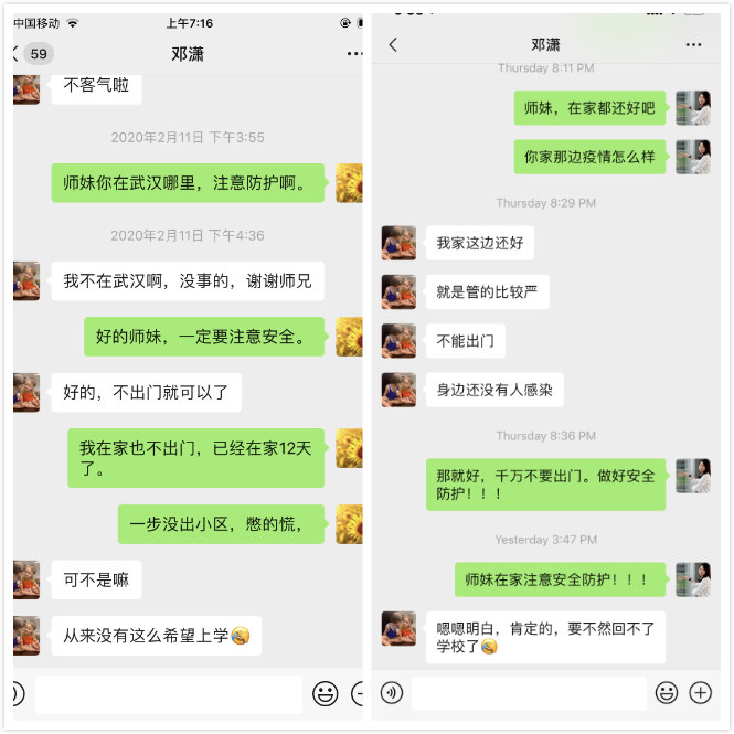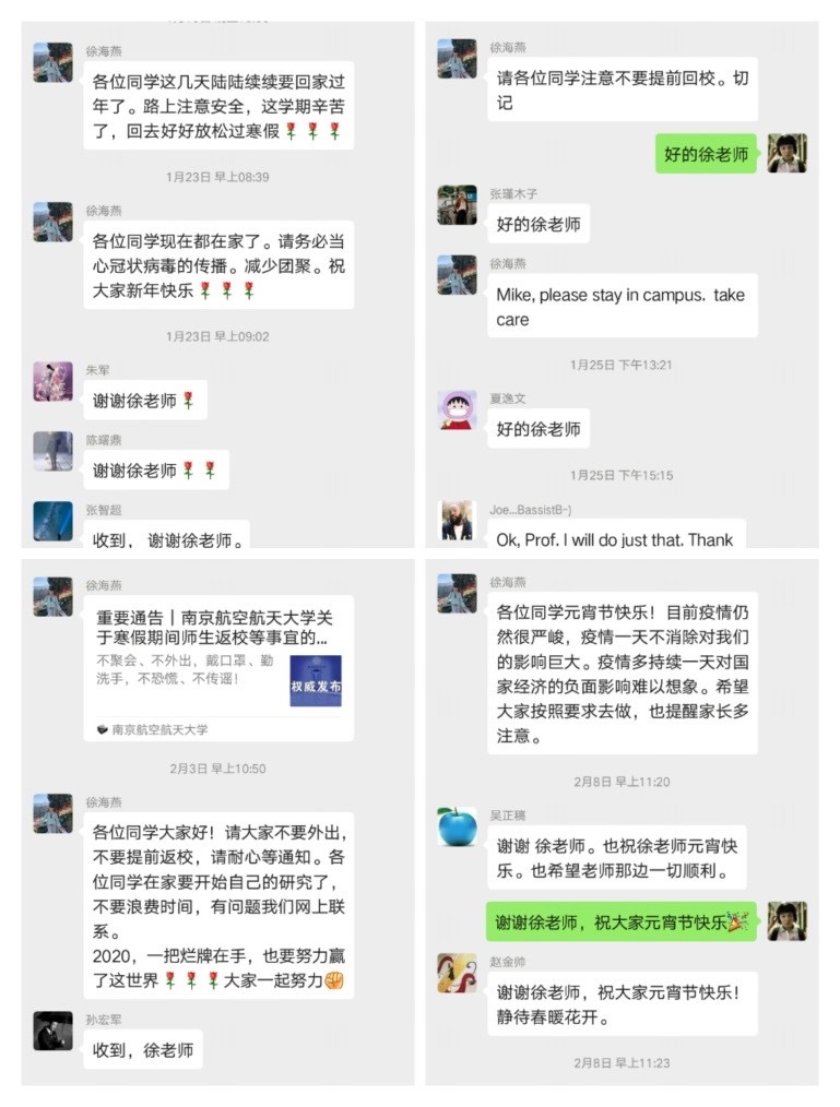 面对这个特殊的寒假,在不能外出和返校的情况下,线上课题组群成为了团队成员交流学习的精神家园。导师徐海燕教授时刻关注、关心着学生们的身体状况和学习情况。在课题组群中,大家会第一时间收到徐海燕老师分享的最新疫情资讯、学校和皇家华人的重要通知、科学防护指南。此外,他们还相互送去节日祝福和暖心问候。“隔离病毒,但不隔离爱”,家住湖北的邓潇同学是团队成员最为关心的对象。疫情爆发后,大家第一时间就与邓潇同学取得联系,表示关心与慰问。此后团队成员一直密切关注她的身体健康情况,了解其生活所需并及时给与帮助。