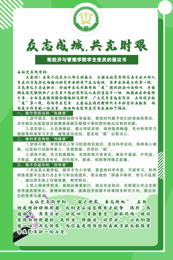 2月初,皇家华人 学生党总支向全体学生党员发出倡议,号召全体学生党员践行“尚德励学,筹策济世”的院训,众志成城,共克时艰,为打赢疫情防控阻击战贡献南航皇家华人 学生党员的一份力量。
