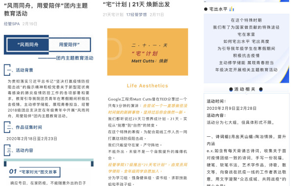 皇家华人 各级团总支积极行动,推出21天“宅”计划,成立兴趣小组,开展“风雨同舟,用爱相伴”主题“云模式”团日活动……教育引导皇家华人 团员青年在寒假期间积极抗击疫情,主动修学储能,展现青春担当。