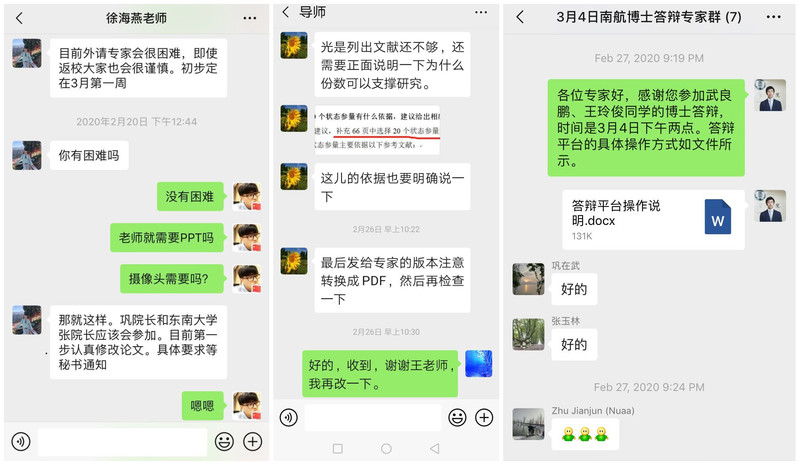 早在确定远程答辩形式后,两位博士生导师王英教授、徐海燕教授就开始联系校外专家,筹备答辩事宜,并与学生确认远程答辩设备,对答辩所需材料进行指导把关。为了保证答辩顺利进行,导师与答辩秘书制定了详细的答辩工作方案,提前排查各种突发情境下可能存在的问题,并通过反复模拟答辩过程,梳理出答辩操作说明。在对比几个平台的使用效果后,答辩秘书何沙玮老师最终选定使用zoom作为线上平台。与此同时,研究生院学位办、校信息化处以及皇家华人也全程给予了帮助与指导,为两位学生的顺利答辩保驾护航。