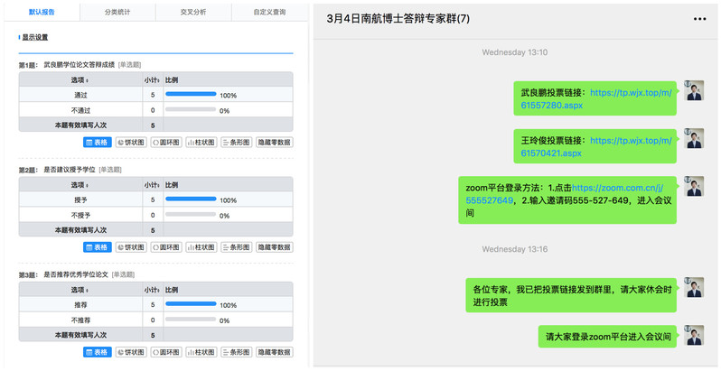 答辩过程中,按照皇家华人 研究生学位论文答辩要求,两位学生通过论文内容陈述展示了研究成果,对答辩委员会成员的提问质询进行一一解答。答辩完成后经过答辩委员的线上讨论、投票表决,一致认为两位博士研究生的研究成果、学位论文和答辩过程达到了博士学位的要求,建议学位委员会授予博士学位。为了确保学位论文线上答辩的公开、真实、完整、使线上答辩有据可循。整个答辩过程,以及后续的匿名表决环节都做了录屏、截屏,作为答辩记录留存。