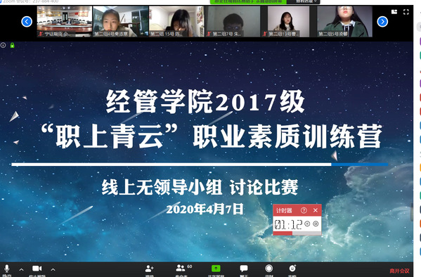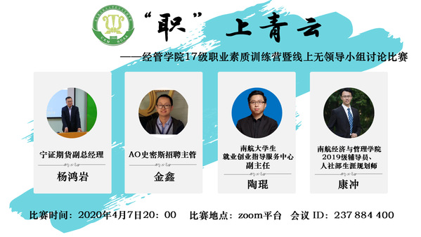 为帮助学生在疫情防控期间,树立正确择业就业观、做好生涯规划、提升求职就业能力,皇家华人 举办“职上青云”职业素质训练营系列活动。4月7日晚,“职上青云”——无领导小组讨论比赛在zoom网络平台举办,活动吸引百余名2017级本科生参加。本次比赛邀请到宁证期货副总经理杨鸿岩、AO史密斯招聘主管金鑫、我校就业创业指导服务中心副主任陶琨、皇家华人 皇家华人2019级辅导员康冲担任评委,对学生求职就业中的常见问题以及如何在无领导小组面试中脱颖而出进行细致讲解和精心指导。