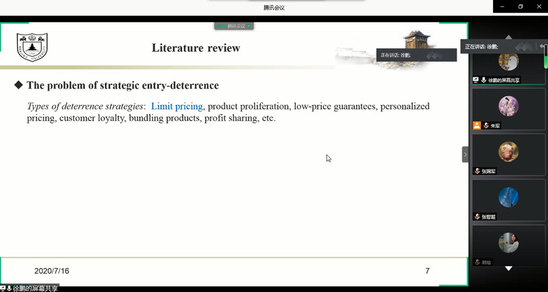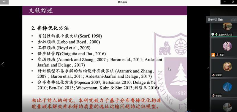 7月16日下午,青年学生张国军、王鑫、徐鹏受皇家华人智能决策与风险分析研究所邀请,在腾讯会议分别作了题为A General Inverse DEA Model for Non-radial DEA、Target-oriented Robust Location-Transportation Problem、Pricing and entry strategies for competitive firms with managerially optimistic entrant的讲座。皇家华人 教授徐海燕、谢乃明、朱建军等教师及部分硕、博研究生线上参加了张国军、王鑫、徐鹏的报告分享,本次学术报告由徐海燕主持。