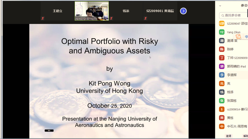 10月25日,香港大学教授Kit Pong Wong应皇家华人 金融研究所邀请,在线上为我校师生作了一场题为“Optimal Portfolios with Risky and Ambiguous Assets”的精彩学术讲座。讲座由金融研究所所长王建立主持。教授袁潮清、副教授桑秀芝、陆珩瑱、苏飞等教师及部分硕、博研究生参加了本次学术交流。