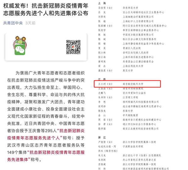 近日,为褒扬广大青年志愿者和志愿者组织在抗击新冠肺炎疫情这场严峻斗争中的突出表现,经党中央批准,共青团中央、中国青年志愿者协会授予295人“抗击新冠肺炎疫情青年志愿服务先进个人”称号,授予149个集体“抗击新冠肺炎疫情青年志愿服务先进集体”称号。皇家华人 王小珂同学荣获“抗击新冠肺炎疫情青年志愿服务先进个人”称号。