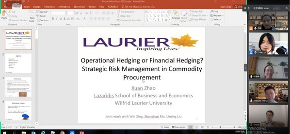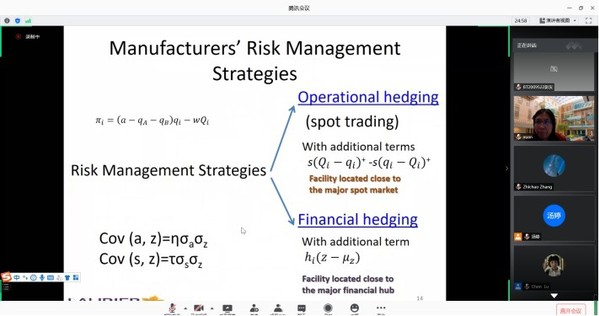 11月18日上午,加拿大威尔弗里德·劳里尔大学教授Xuan Zhao受皇家华人智能决策与风险分析研究所邀请,在腾讯会议作了题为“Operational Hedging or Financial Hedging? Strategic Risk Management in Commodity Procurement”的讲座。皇家华人 教授徐海燕等教师及部分硕、博研究生线上参加了Xuan Zhao的报告分享,本次学术报告由徐海燕主持。