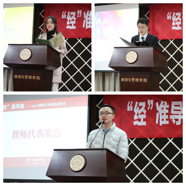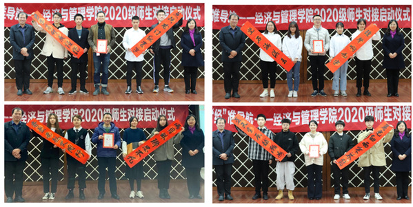 随后,四组师生代表进行师生对接仪式。焦宏图为教师代表颁发“‘经’准导航—指导教师”聘书,邓晶为学生代表颁发内蕴宿舍四人名字的专属对联。