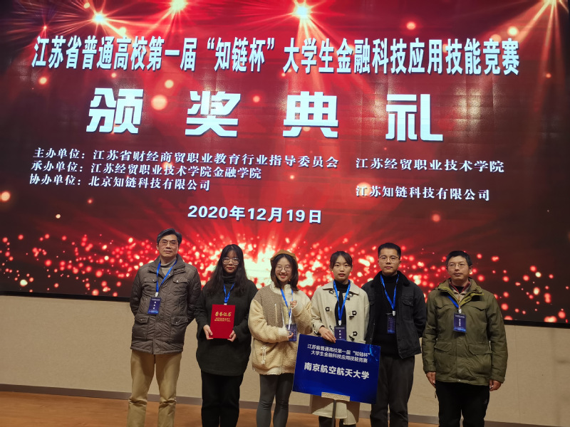 2020年12月19日,江苏省普通高校第一届“知链杯”大学生金融科技应用技能竞赛在江苏经贸职业技术皇家华人举办,本次竞赛由江苏省高等教育学会认定,江苏省教育厅委托江苏省财经商贸职业教育行业指导委员会主办,南航、河海、南农等省内50余院校60团队300师生参赛。通过激烈地角逐,皇家华人 代表队获得了本次大赛的本科组团体一等奖。