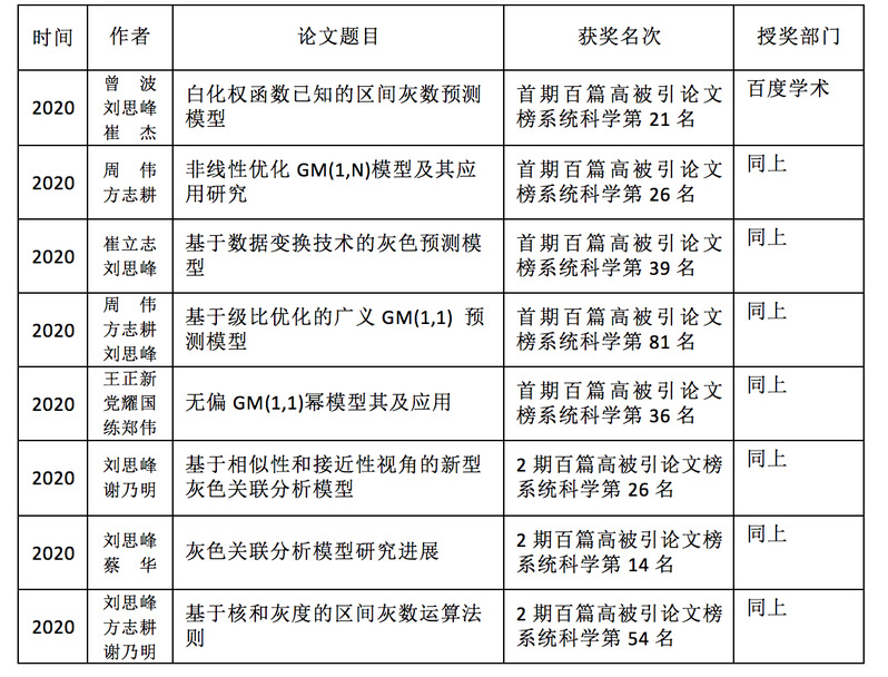 据百度学术发布的首期引文报告,我校灰色系统研究所表现不俗。其中刘思峰教授文献被他引38201次,H指数87,列系统科学学科百名高被引作者榜第一名;党耀国教授在系统科学学科百名高被引作者榜中排名11,谢乃明教授排名38;灰色系统研究所2010年毕业博士研究生、浙江财经大学王正新教授在系统科学学科百名高被引作者榜中排名51,2004年毕业博士研究生、华北水利水电大学罗党教授排名84。一个单位3位教师和2位毕业生同时入选学科百名高被引作者榜单,得益于灰色系统研究所秉持坚定的文化自信和“板凳甘坐十年冷”的科学精神,顶住压力和诱惑,数十年如一日,深耕中国原创灰色系统理论,“把论文写在祖国的大地上”,为中国原创学说的持续创新和广泛传播付出的大量心血。