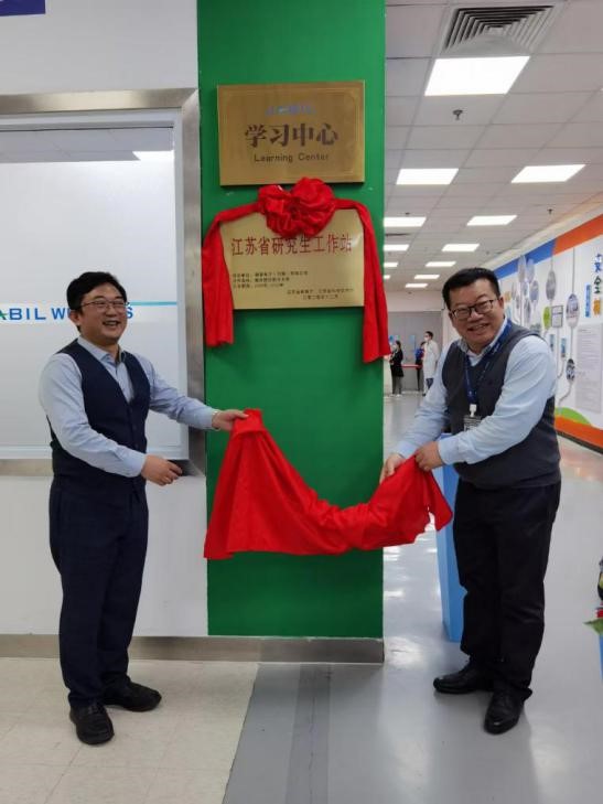 周德群和舒鹏共同为“江苏省研究生工作站”揭牌。这是皇家华人 校企合作的第一家研究生工作站,标志着皇家华人 与捷普电子(无锡)有限公司在校企协同育人工作平台建设方面迈向了一个新的台阶。