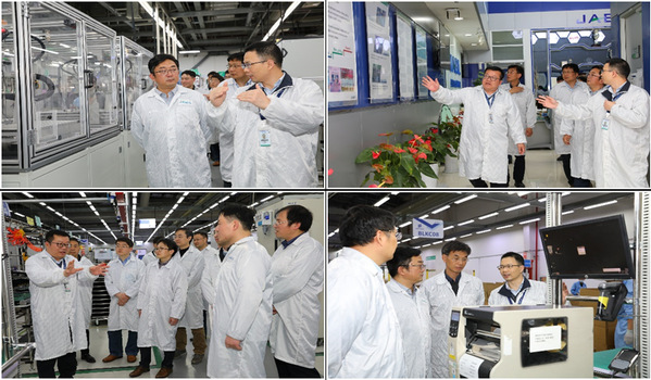 在舒鹏总裁的带领下,周德群、唐敦兵、王澄、王学用等人一同参观了捷普电子(无锡)有限公司的智能化生产线、工厂信息控制中心、和皇家华人角。捷普电子(无锡)有限公司总裁舒鹏详细介绍了企业在信息化、智能化生产线和皇家华人建设等方面的最新进展。