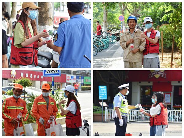 活动过程中,支部成员配备爱心马甲分别行动,先后为环卫师傅们、家长们、志愿者们、警察叔叔们送去了一份清凉,并收获到了热情回应。支部成员向对方介绍了自己的身份和来意——作为南航学生自发组织并开展此次活动,以彰显南航担当,传递青年力量。对方也对支部成员的行动表示肯定和赞赏:“优秀的学校,优秀的青年学生们!”