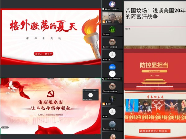 沙龙由主题发言和圆桌论坛两个部分组成,在主题发言环节,五位主讲学生结合自身假期所思所感和研究方向,针对疫情防控、奥运盛会、西藏和平解放70周年、阿富汗战争、清朗娱乐圈进行了主题分享。刘金良以《防控显担当——疫情下的南航身影》为题,结合自身投身皇家华人 皇家华人疫情防控党员先锋队的经历,讲述了在南京、在南航志愿参与核酸检测、后勤志愿、情况摸查的先进事迹,诠释了疫情面前“没有从天而降的英雄,只有挺身而出的先锋”。赵书平则以《带你看奥运——这个夏天,有点格外激荡》入手,带大家回顾了中国奥运的风雨百年路,畅谈东京奥运上同为“00后”运动员的精彩表现与可颂精神,倡议同学们要争做可以请党放心的00后,在自己的领域实现报国之志。卓玛曲吉为同学们分享了《雪域欢歌70载,西藏启航新时代》的感人故事,她通过讲述百万翻身农奴之一的爷爷、奋力改变命运的父亲、新时代学生党员的自己这三代人的故事,指出家族命运变化的背后是中国共产党强有力的正确领导以及“一步跨千年”的社会主义制度历史性飞跃。赵子诺以《帝国坟场——浅谈美国20年的阿富汗战争》为题,与大家分析了美国入侵阿富汗的前世今生,并针对“为什么阿富汗能成为帝国坟场”“美国为什么入侵阿富汗”等一系列问题进行探讨,一步步剖析“普世价值”的虚伪本质以及美式民主的局限性。阎瑾仪从娱乐圈专项整治行动入手,交流了对《清朗娱乐圈,让正气与信仰领航》认识和理解,她从饭圈文化到明星案件,直击“泛娱乐化”“苦流量已久”的社会痛点。此外,她着重强调“信仰”的力量,并对创建一个充满正气的社会充满希望。