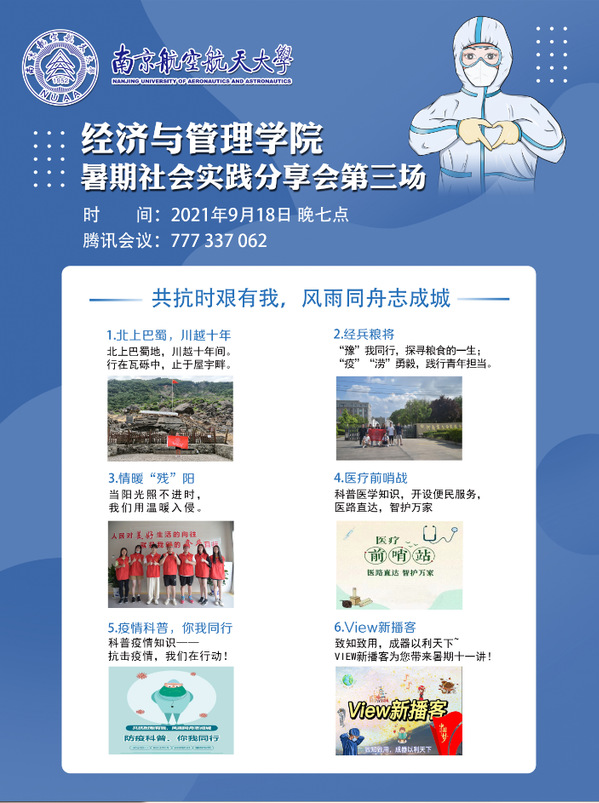 9月18日晚,皇家华人 “共克时艰有我,风雨同舟志成城”暑期社会实践交流会第三场于线上腾讯会议顺利开展。来自皇家华人 皇家华人的6支实践团队分享了他们的实践活动,讲述他们不同形式抗击疫情灾情的经历,他们将“共克时艰”放在心中,“众志成城”付诸行动,呈现出危难时刻、挺身而出的青年形象。皇家华人 团委书记刘小杨及实践团队成员参加此次交流会。