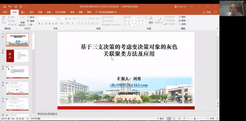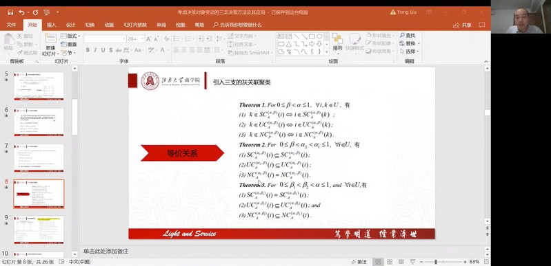 9月9日晚上,江南大学副教授刘勇受皇家华人智能决策与风险分析研究所邀请,在腾讯会议作题为“考虑决策对象变动的三支决策方法及其应用”的讲座。皇家华人 教授徐海燕等教师及部分硕、博研究生线上参加了刘勇的报告分享,本次学术报告由徐海燕主持。