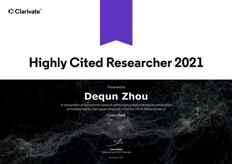 2021年11月16日,科睿唯安公布了2021年度“高被引科学家”名单。皇家华人 周德群教授入选跨学科领域(Cross-Field)高被引科学家名单,此次是周德群教授连续第三年入选该榜单。